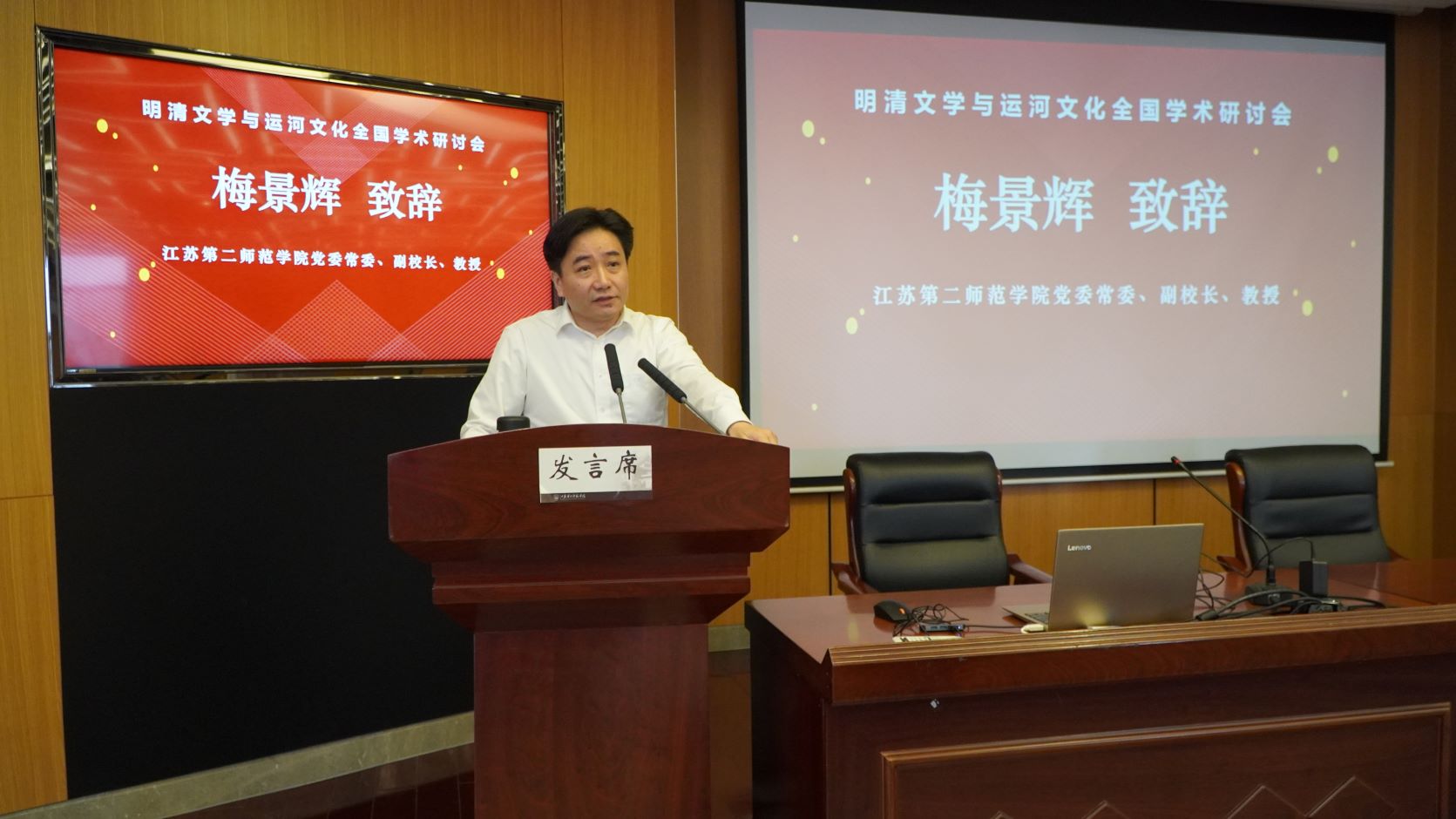 5月25至26日,由江苏省明清小说研究会、江苏第二师范学院文学院、江苏省社科院文学研究所、大运河文化带建设研究院文学艺术中心、天津市红楼梦研究会主办,江苏省高校哲学社会科学重点研究基地江苏第二师范学院江苏区域文学与文化研究中心承办,“明清文学与运河文化全国学术研讨会”在我校举行。江苏省社科联党组成员、秘书长程彩霞,我校党委常委、副校长梅景辉,教育部“长江学者”特聘教授左东岭、朱万曙,中国红学会会长孙伟科教授等来自北京大学、南京大学、北京师范大学、中国人民大学、华东师范大学、南京师范大学、中国艺术研究院等高等学校、科研院所80多位专家学者,汇聚文学之都南京,在美丽的清凉山麓、石头城下,就明清文学研究与运河文化诸多学术前沿问题,展开了深入探讨。会议由江苏省明清小说研究会会长、我校人文学部主任冯保善教授主持。