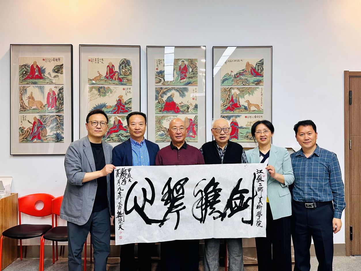 刘梵天老先生为美术学院题字:“剑胆琴心”,并与师生亲切合影。