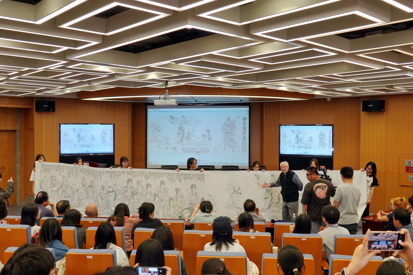 讲座过程中,刘老展示了个人创作的生宣白描《维摩演教图》,该作生动地讲述了维摩诘向文殊菩萨宣讲大乘教义的宏大场面,画面故事情节生动,创作过程,绘画技巧丰富具体。席间校领导及美院师生不时近距离观摩、交流、互动,现场氛围热烈。