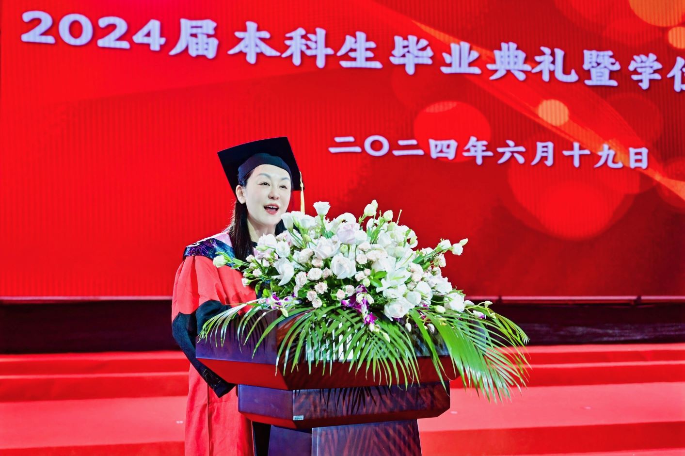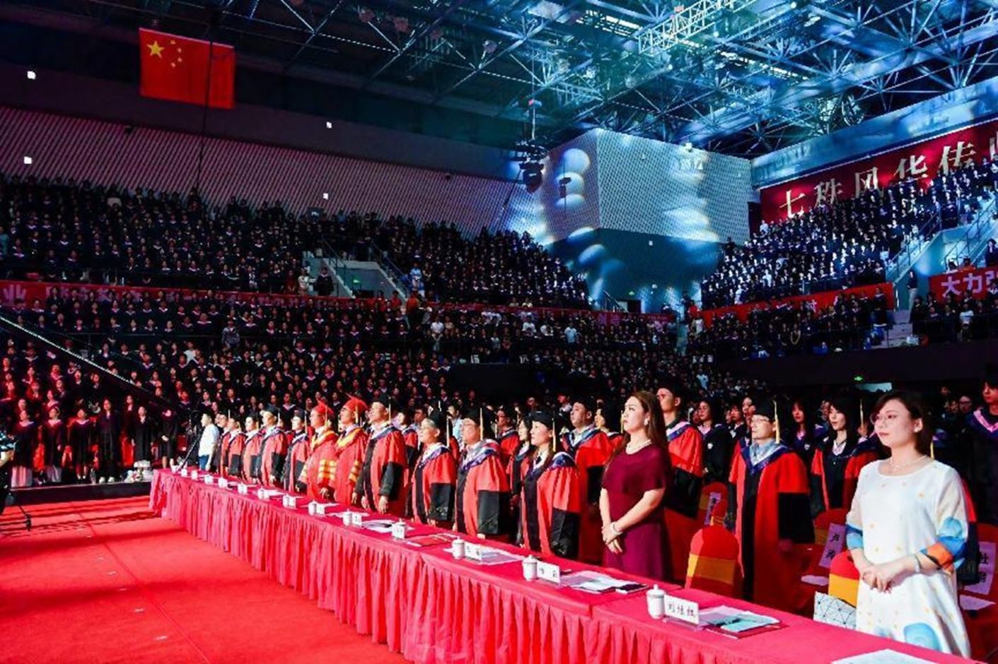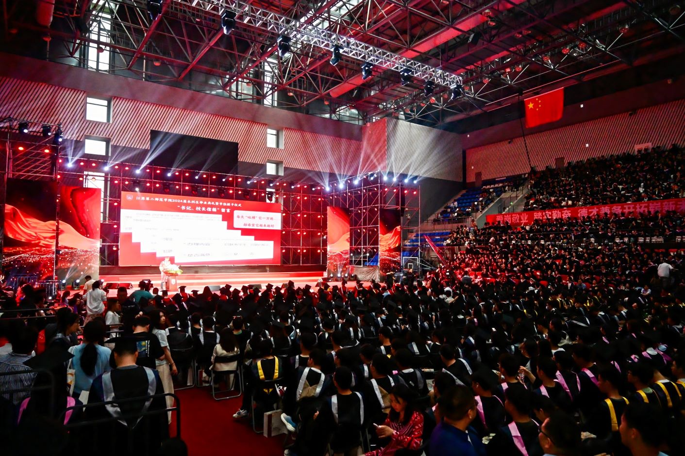 典礼开始前,现场播放着祝福视频,2024届毕业生相聚一堂,互道珍重,意气风发。毕业典礼在嘹亮的国歌声中正式开始。