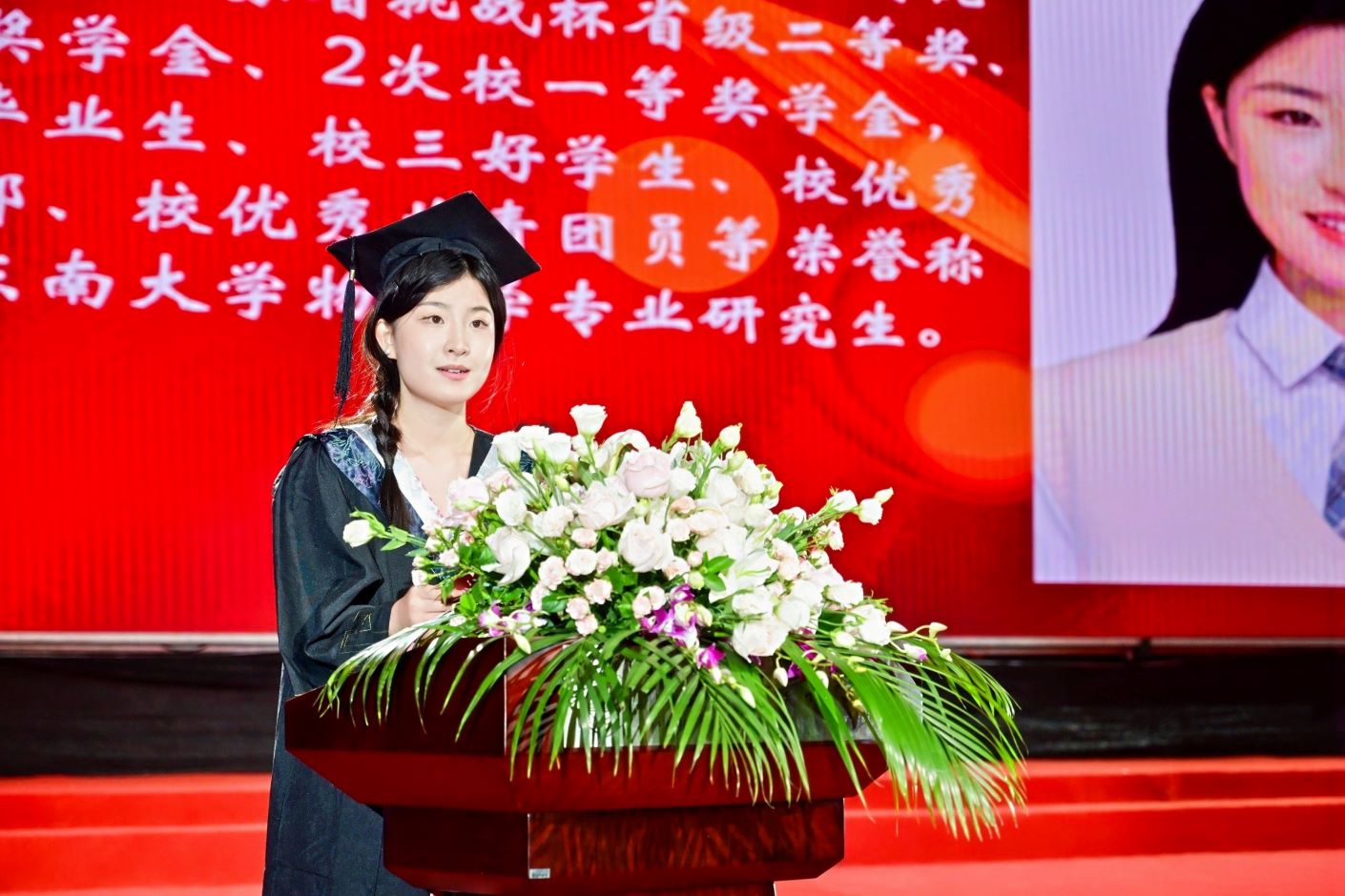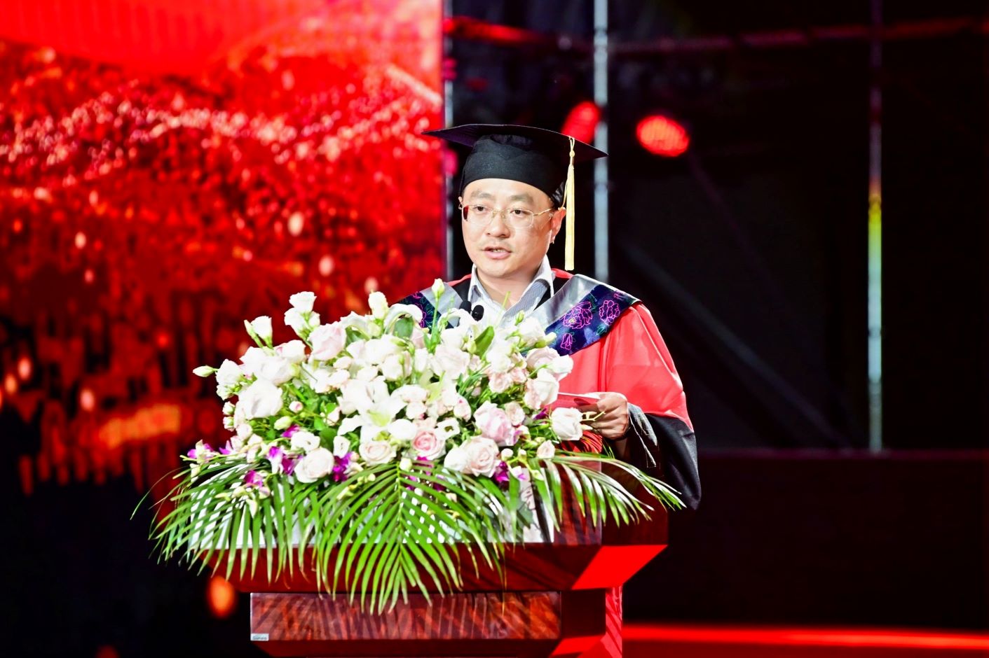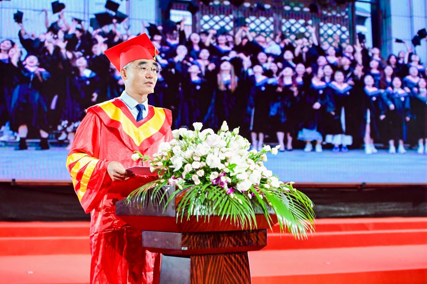 典礼开始前,现场播放着祝福视频,2024届毕业生相聚一堂,互道珍重,意气风发。毕业典礼在嘹亮的国歌声中正式开始。