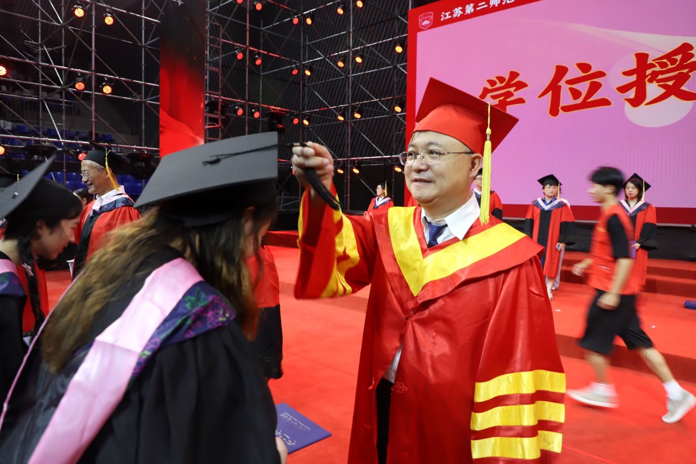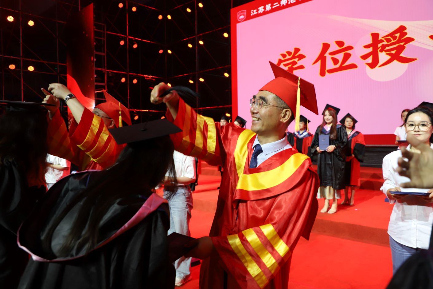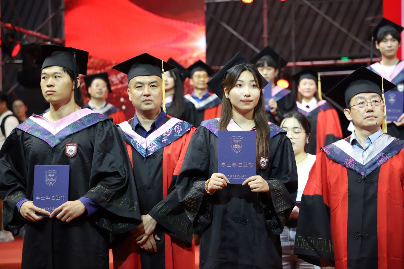 毕业典礼后,举行了2024届毕业生学士学位授予仪式。校领导、二级学院负责人、主要职能部门负责人为全体毕业生一一拨穗、颁发学士学位证书。