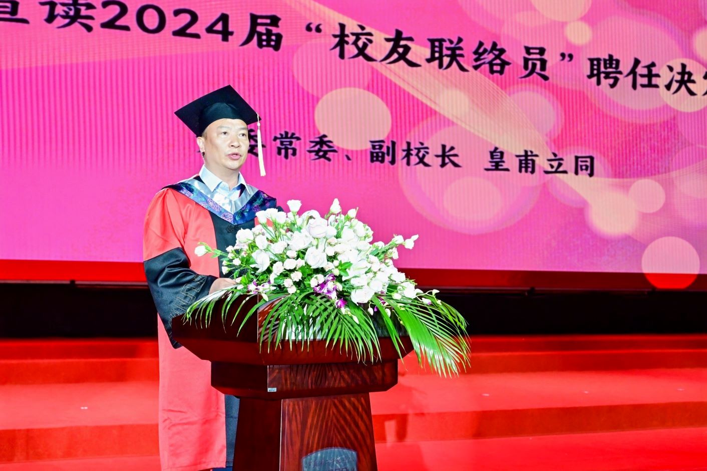 铸魂担使命,腾飞启新航。皇甫立同宣读2024届“校友联络员”聘任决定,梅景辉宣读2024届“优秀毕业生”表彰决定,花书贵宣读2024届毕业生学位授予决定。王鲁沛为“优秀毕业生”代表颁发荣誉证书,赵玉蓉为“校友联络员”代表颁发聘书。崔燕、姚振标接受了毕业生代表赠送母校的作品。