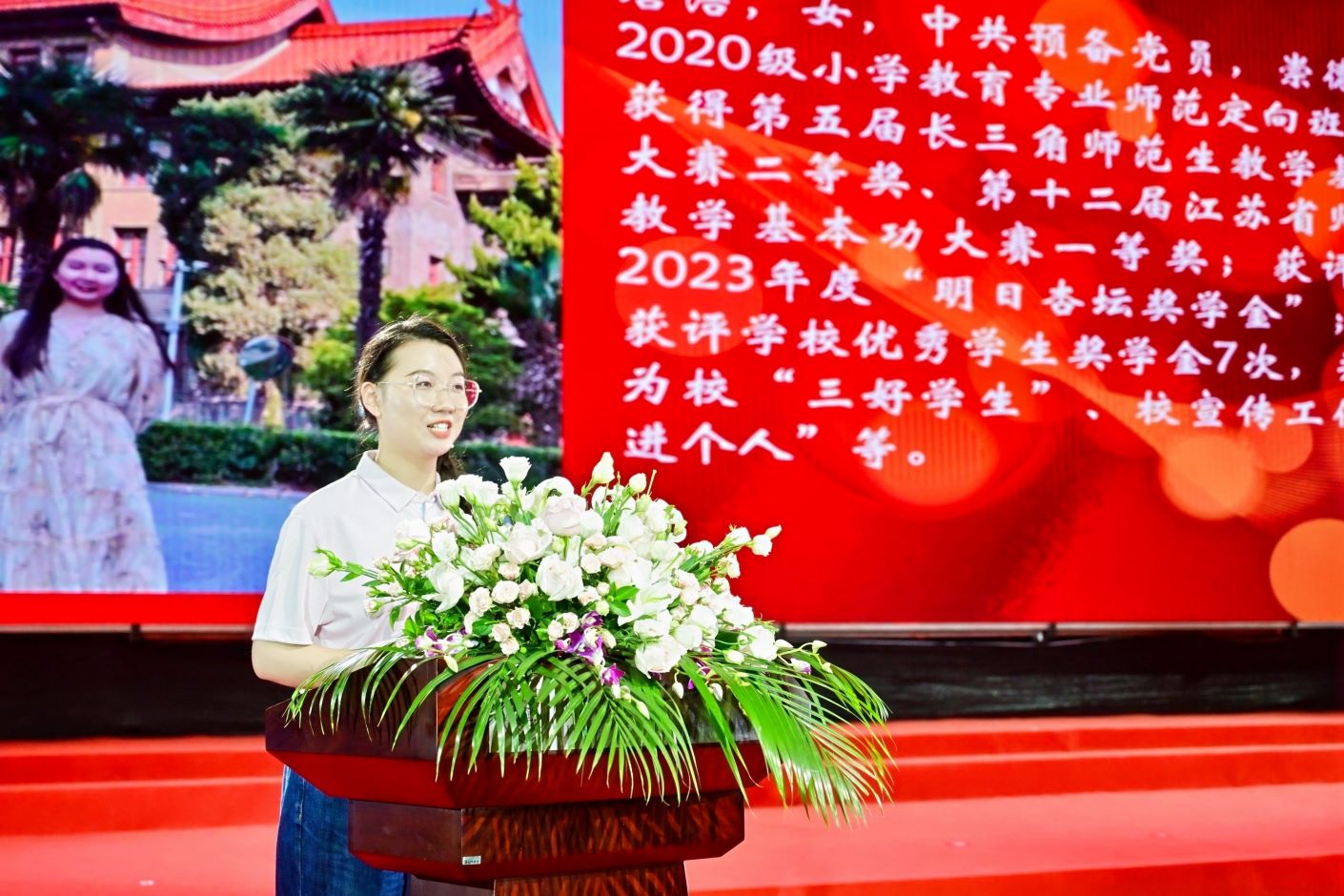 崇德书院小学教育定向班的唐浩、求真书院20级物理师范普本班的伍凡作为毕业生代表发言。他们回顾了在江苏二师的宝贵瞬间,表示作为一名“江苏二师人”,要做怀揣梦想脚踏实地的人、做拥有智慧富有激情的人、做德才兼备敢挑重任的人,成为新时代奋勇前进的搏击者。