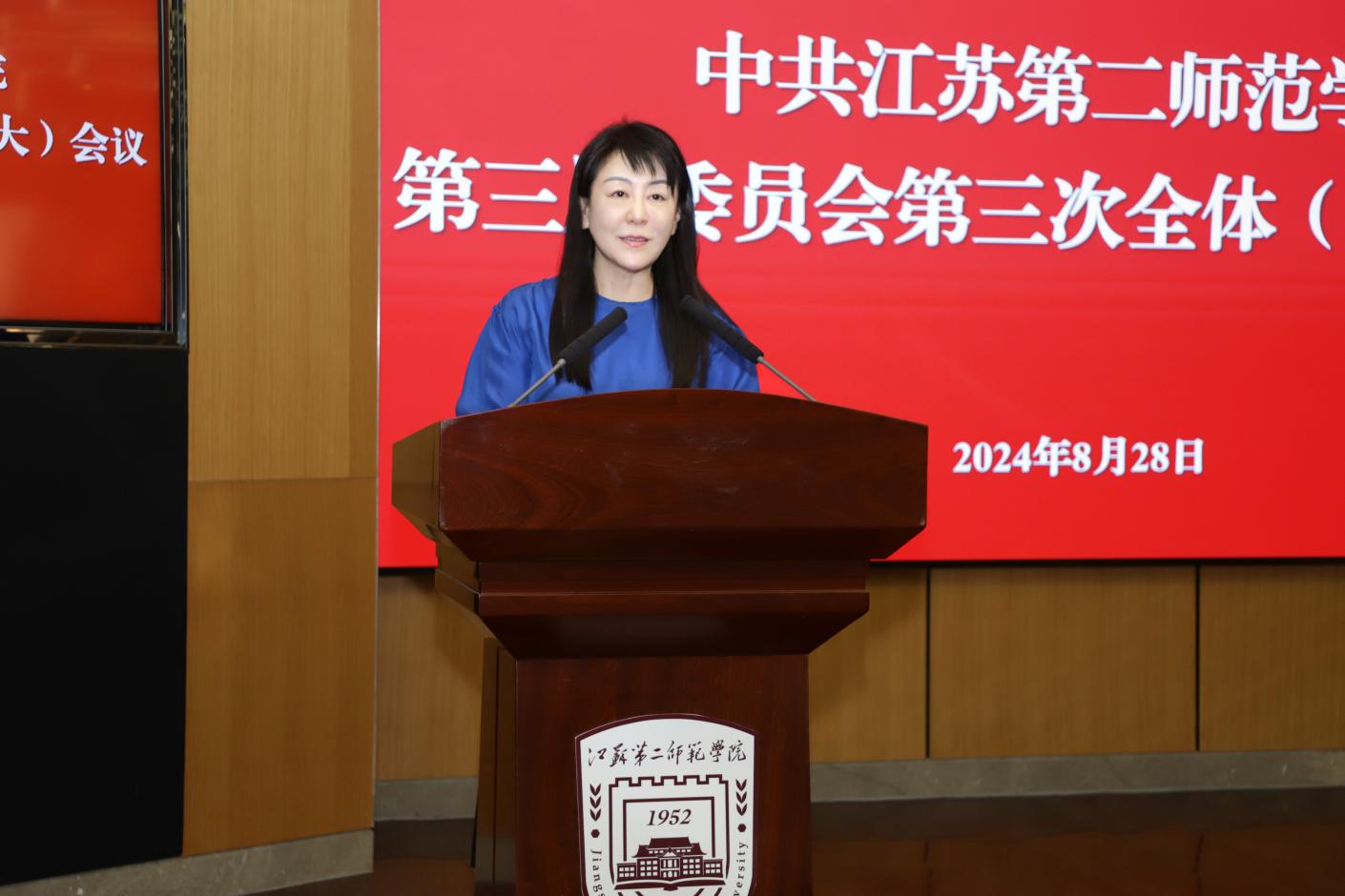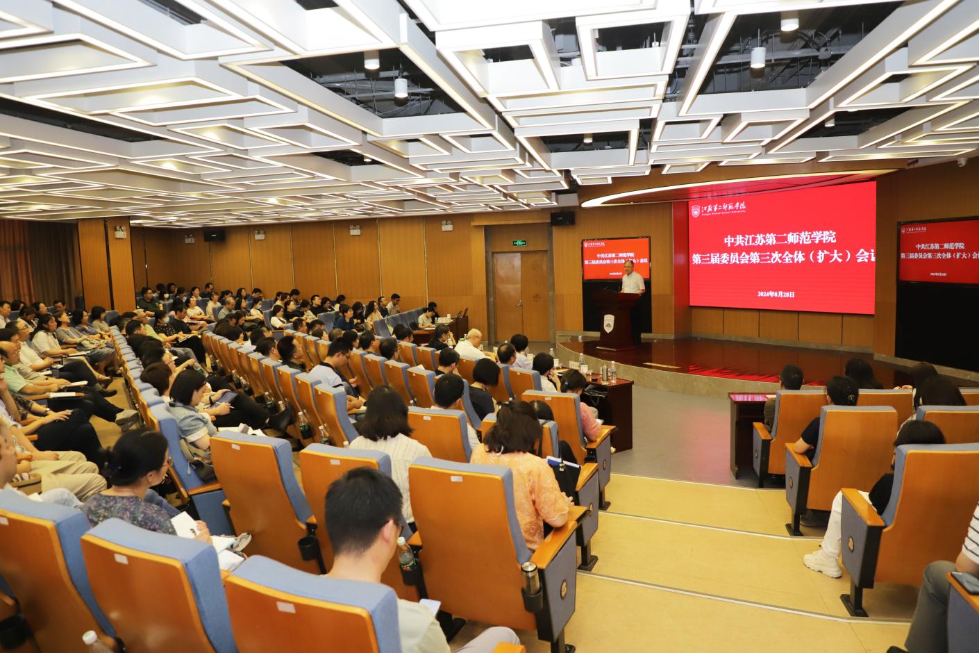 8月28日下午,中国共产党江苏第二师范学院第三届委员会第三次全体(扩大)会议在草场门校区召开。党委书记王鲁沛代表党委常委会作工作报告,党委副书记、副校长刘继红主持会议并部署开学工作。校领导、党委常委、党委委员、纪委委员,全体中层干部等出席会议。