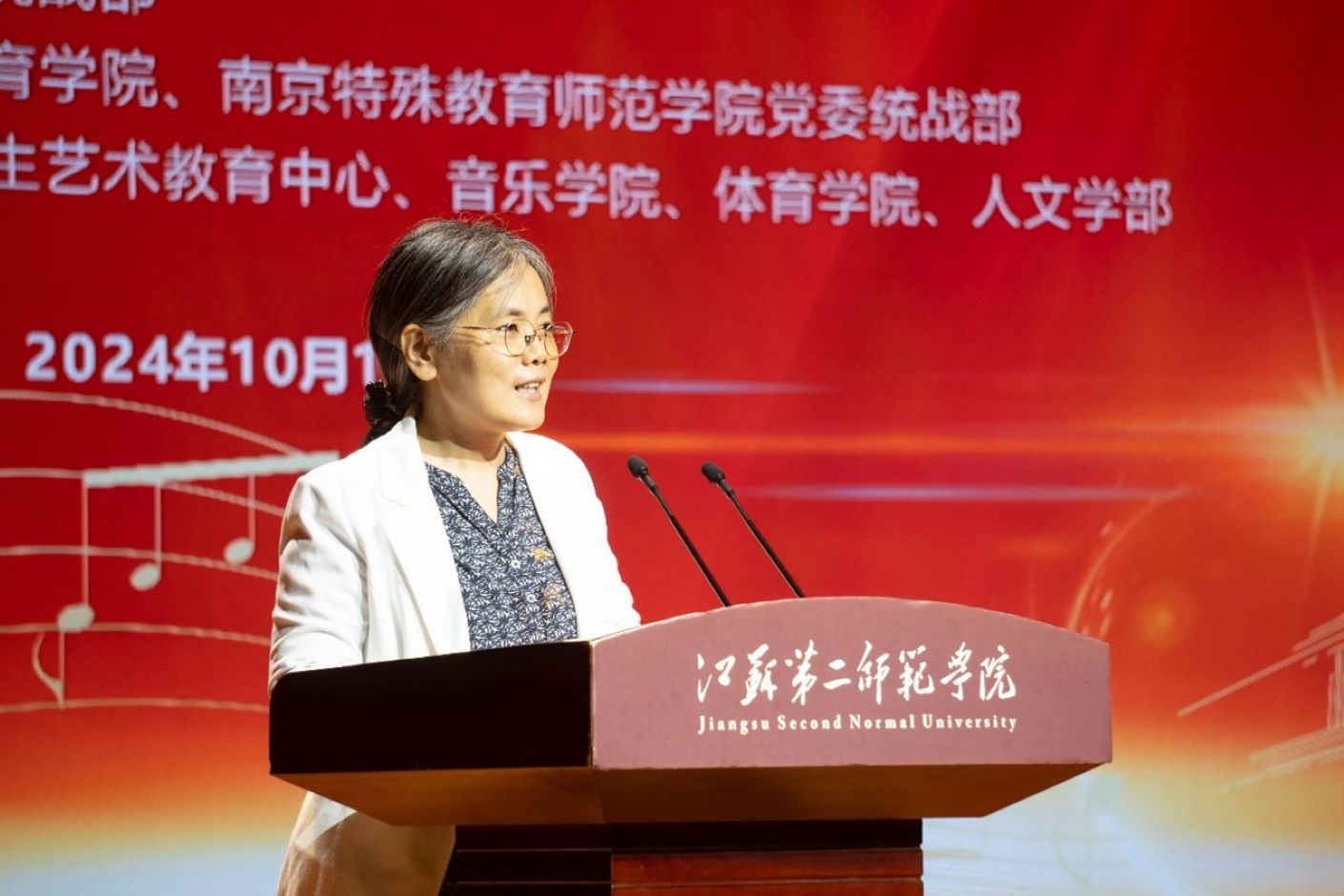 赵玉蓉在致辞中向长期以来关心支持江苏第二师范学院建设发展的各位领导、来宾表示感谢。她指出江苏第二师范学院始终把铸牢中华民族共同体意识教育融入立德树人全过程,通过开展“铸牢中华民族共同体意识·二师在行动”系列活动,弘扬中华美育文化,提升校园文化品位和师生的审美情趣、人文素养。此次活动的举办,进一步促进了我校与南京艺术学院、南京体育学院、南京特殊教育师范学院等兄弟院校的合作交流。