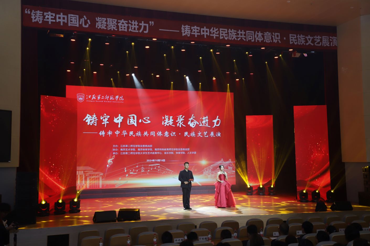 为进一步加强铸牢中华民族共同体意识教育,10月16日下午,我校在石湫校区尚美楼二楼报告厅举办“铸牢中国心 凝聚奋进力”——铸牢中华民族共同体意识·民族文艺展演。省委统战部二处副处长陈雪晴,市委统战部一级调研员张福东,市委统战部新阶层处处长徐静,市民宗局党组成员、副局长张颖华,市民宗局民族处副处长郭震,鼓楼区委统战部副部长、民宗局局长任明璋,溧水区委统战部副部长、民宗局局长高明芳,南京体育学院党委常委、党委宣传部、统战部部长许立俊,南京特殊教育师范学院党委常委、党委统战部部长、学生工作处处长高飞,江苏第二师范学院党委常委、副校长赵玉蓉,党委常委、党委宣传部部长李安林,党委常委、党委统战部部长陈蓓,南京艺术学院等兄弟院校师生代表,江苏第二师范学院统一战线工作领导小组、民族宗教工作领导小组成员、师生代表观看演出。赵玉蓉代表学校致辞。