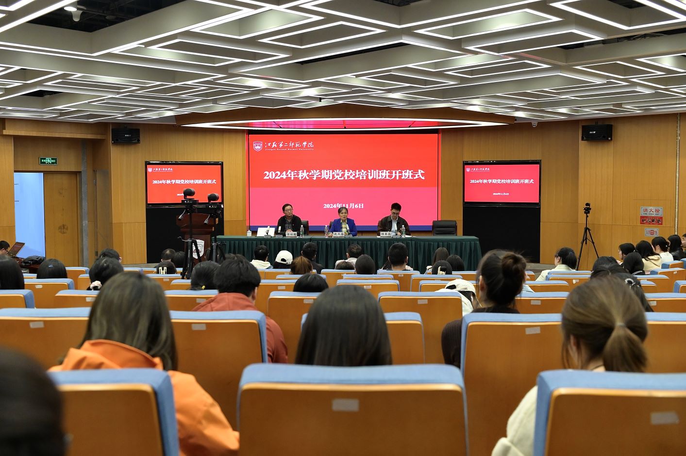 为深入学习贯彻习近平新时代中国特色社会主义思想和党的二十届三中全会精神,切实提升入党积极分子、党员发展对象和预备党员的政治素质和理论修养,11月6日晚上,我校2024年秋学期党校培训班开班式暨专题辅导报告会通过同步直播的方式分别在草场门校区现代教育技术楼二楼报告厅和石湫校区尚美楼二楼报告厅举行,邀请南京市委党校郝继明教授作专题辅导报告。党委常委、副校长、党校校长赵玉蓉出席会议并讲话,学生党支部书记、师生党员代表及500余名培训班学员参加本次开班式。开班式及专题辅导报告会由党校常务副校长兼党委组织部副部长眭春良主持。