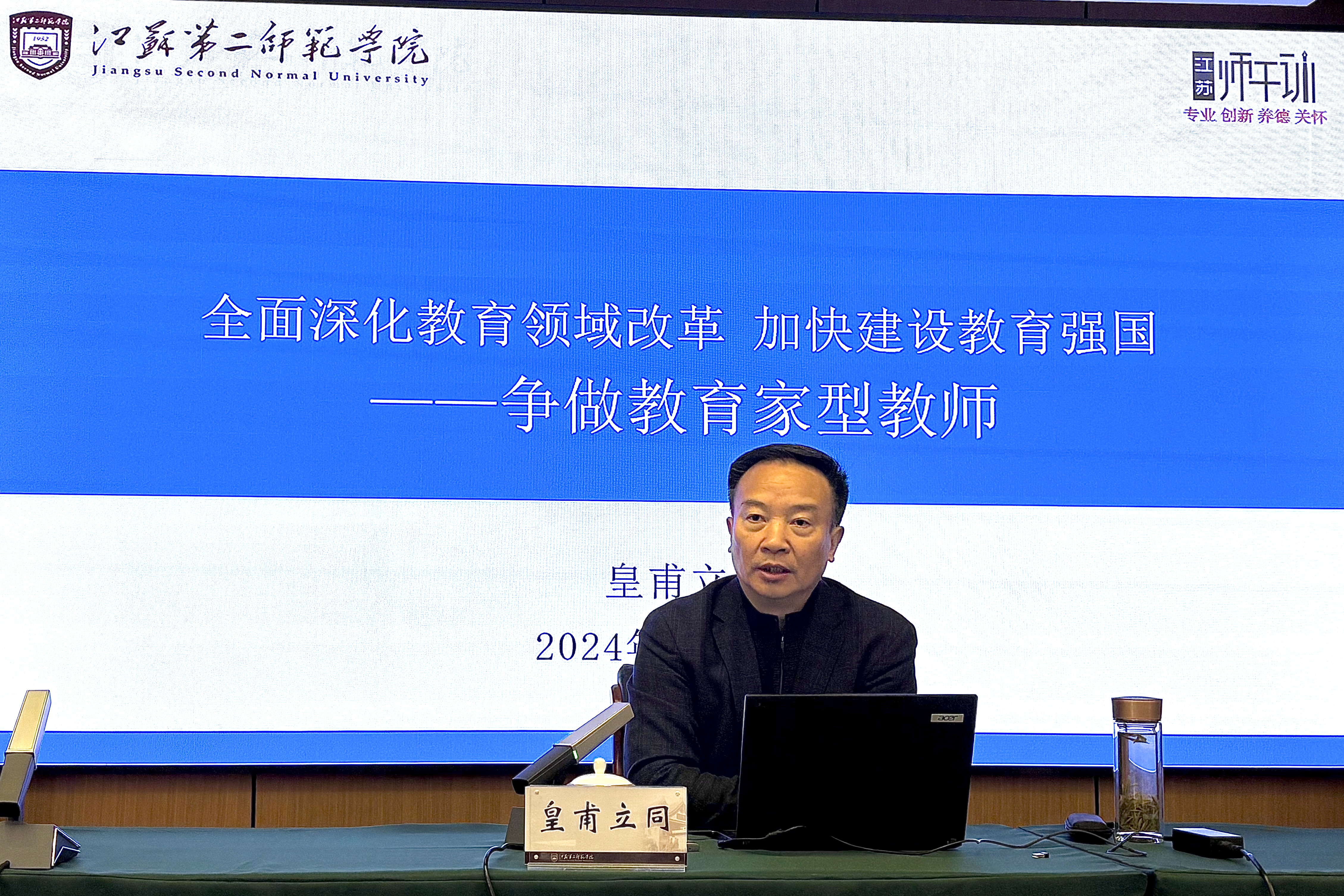 近日,我校举办新教师培训专题讲座。校党委常委、副校长皇甫立同以“全面深化教育领域改革,加快建设教育强国--争做教育家型教师”为题作报告。2024年全体新入职教师现场聆听此次讲座。讲座由人事处副处长邵天松主持。