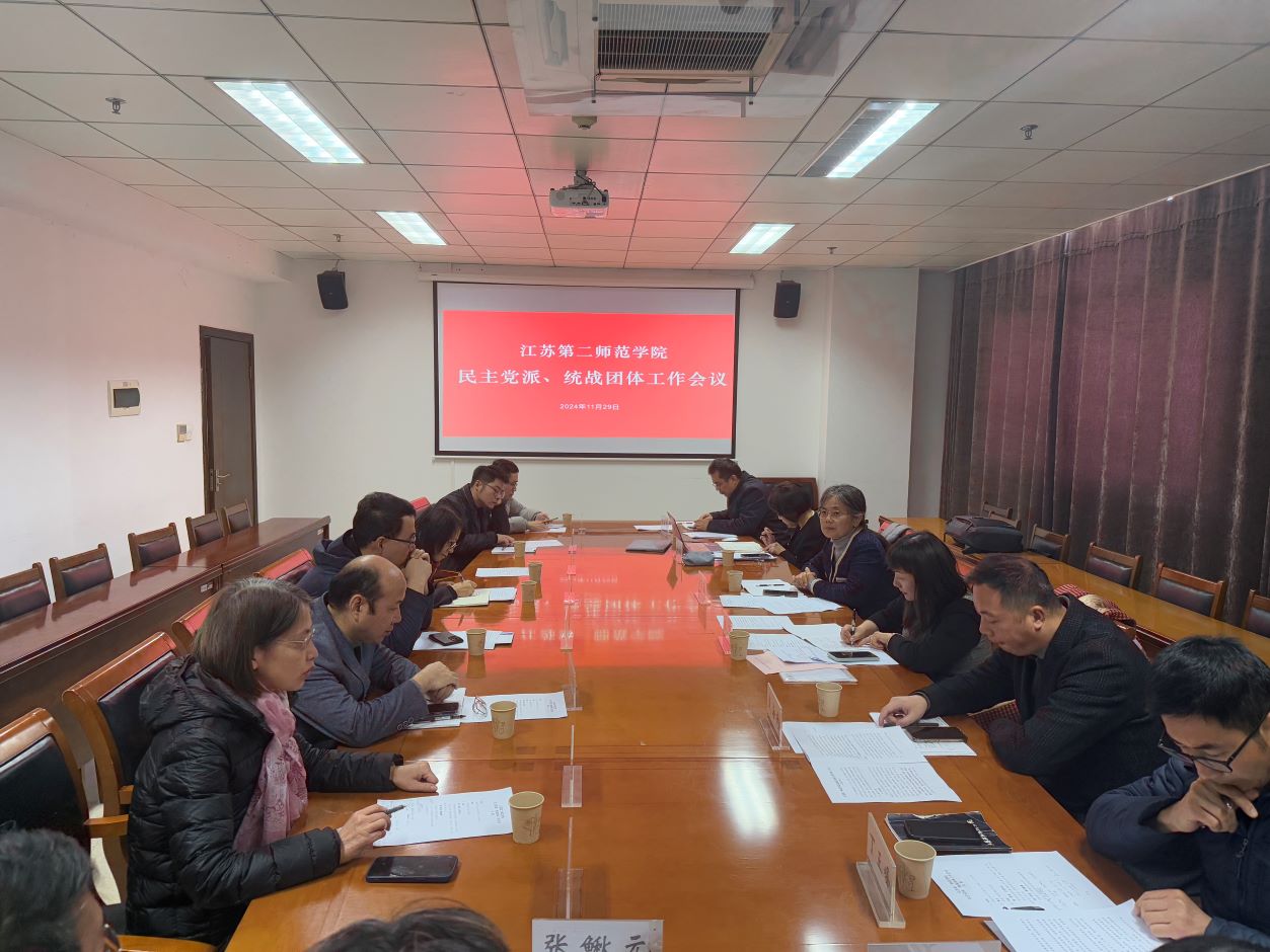 陈蓓汇报2024年度党委统战部重点工作及2025年工作计划。民盟江苏第二师范学院支部主委、数学科学学院教授、江苏省政协委员毛伟,民进江苏第二师范学院支部主委、学前教育学院研究员徐群,农工党江苏第二师范学院支部副主委、大学生艺术教育中心主任孙婷,我校党外知识分子联谊会秘书长、江苏省师干训中心副主任蔡公煜,我校欧美同学会副会长、音乐学院副教授陈霄分别介绍所在党派、团体2024年度重点工作任务及2025年工作计划。