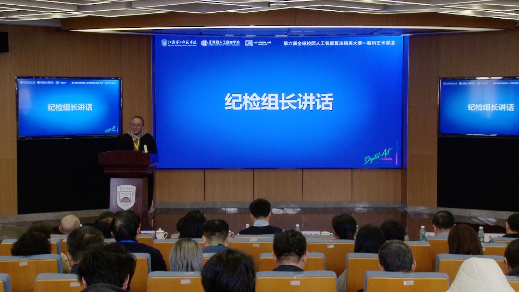江苏省人工智能学会秘书长房伟在大会致辞。他表示,全球校园人工智能算法精英大赛聚焦“人工智能+X”知识体系下的人才能力培养,为加快人工智能算法创新人才培育、提升学生高质量创业就业探索出一条新途径。数码艺术赛道作为今年大赛新设的赛道,希望激励高校学子利用人工智能技术进行数字艺术创作的热情,积极探索人工智能与艺术的融合创新。