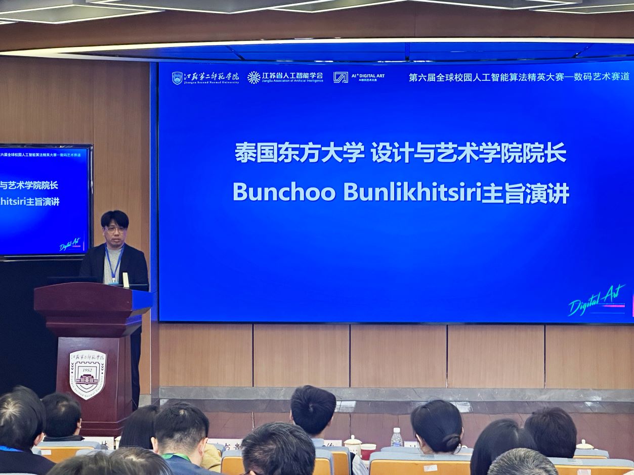 泰国东方大学艺术学院院长本初(Bunchoo)教授进行主旨演讲。他指出,人工智能迅速成为我们时代最具变革性的技术之一,本次大赛旨在培养学生将技术与人文学科、工程与美学、逻辑与情感融合在一起的思维方式。通过推广将 AI带入艺术领域的比赛和举措,赋予参赛学生探索技术和创造力结合的无限可能性。