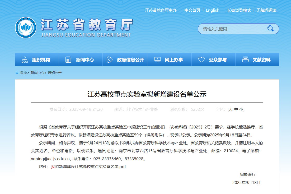 9月18日,江苏省教育厅网站公示了2025年度《拟新增建设江苏高校重点实验室名单》,我校数学科学学院与传媒学院联合申报的“数学智能与视觉计算”实验室获批为江苏高校重点(建设)实验室,这标志着我校在人工智能与数学交叉领域取得了新突破。