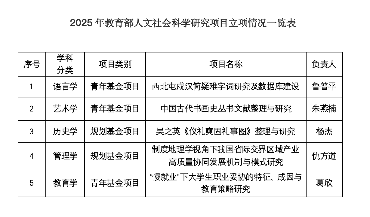 近日,全国哲学社会科学工作办公室和教育部相继公布2025年度国家社会科学基金项目以及教育部人文社会科学研究项目立项名单。我校获批国社科项目3项,均为青年项目;获批教育部人文社科项目5项,其中规划基金项目2项、青年基金项目3项。这一成绩展现了我校科研工作的稳步推进和多点突破的良好态势。