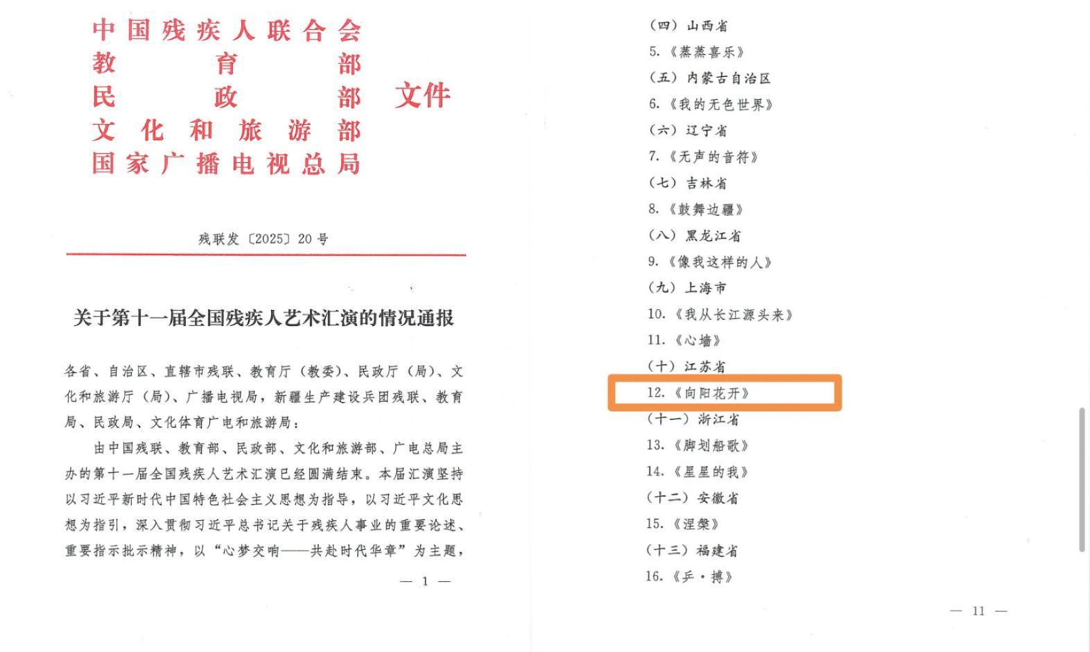 近日,第十一届全国残疾人艺术汇演落下帷幕,由我校大学生艺术教育中心教师精心指导、常州市中吴实验学校学子演绎的舞蹈作品《向阳花开》,凭借深刻的情感表达与精湛的艺术呈现,荣获由中国残联、教育部、民政部、文化和旅游部、广电总局主办的第十一届全国残疾人艺术汇演“一类作品”荣誉。作品已在第十一届江苏省残疾人艺术汇演中斩获舞蹈类一等奖,从省级夺冠到全国出彩,用艺术力量书写了残障学子的成长奇迹。