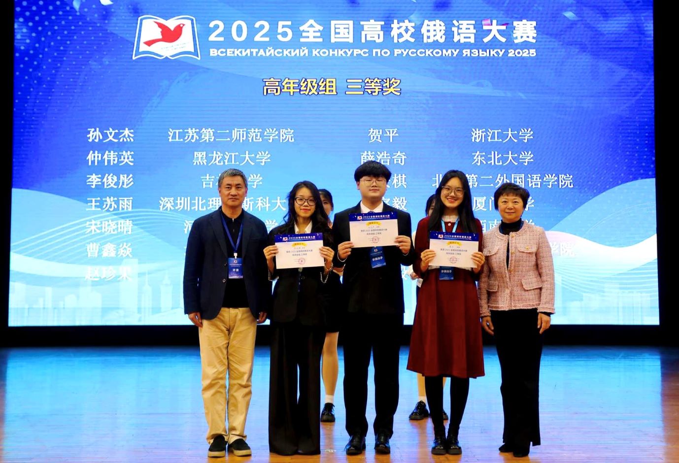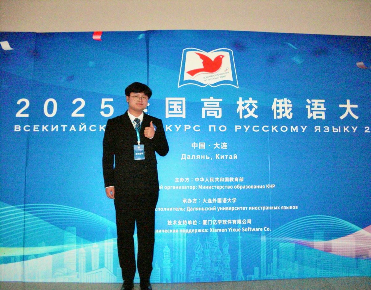 2025年10月25至26日,由教育部国际合作与交流司主办、大连外国语大学承办的2025全国高校俄语大赛落下帷幕。外国语学院2022级俄语普本班孙文杰同学荣获高年级组三等奖(全国第九名,三等奖排名第一),再创历史最佳成绩,并获国家留学基金委全额资助赴俄罗斯攻读研究生资格。