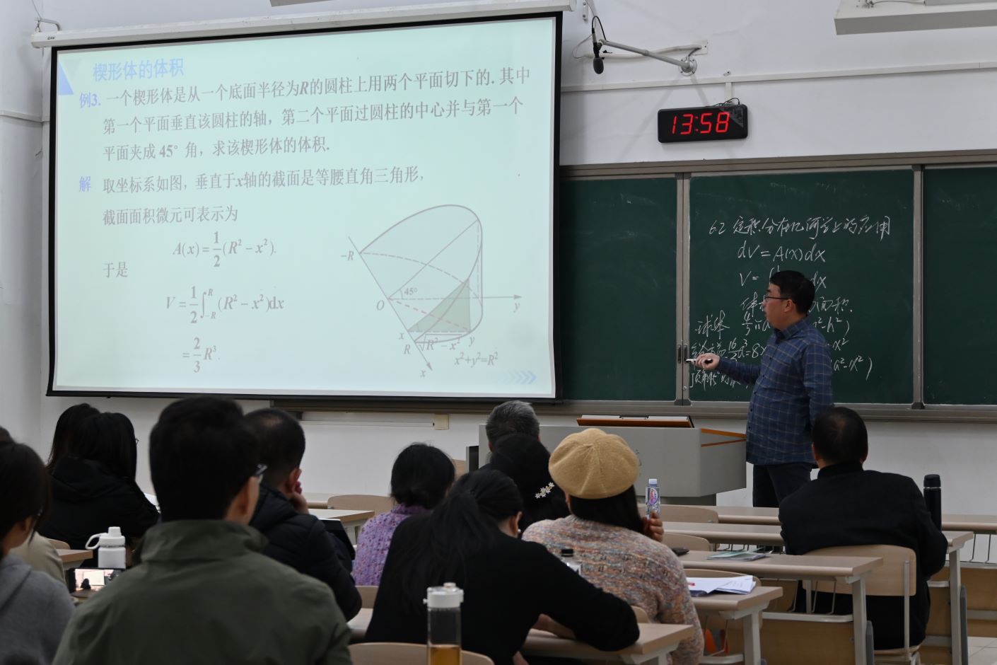 崔周进老师结合第十一届江苏省数学基础课教师教学竞赛获奖课《定积分在几何学中的应用》进行教学展示。他巧妙融合数学逻辑与思政内涵,在讲解定积分几何应用的同时,融入数学史中的科学精神与辩证思维,呈现了一堂富有感染力的思政示范课。随后,与会教师围绕思政元素挖掘、课堂引导技巧等展开热烈讨论。周群、沈振东等专家从跨学科视角提出建议,在高度评价授课效果的同时,进一步强调结合数学学科特点,实现科学精神、家国情怀与教学内容的自然融合。