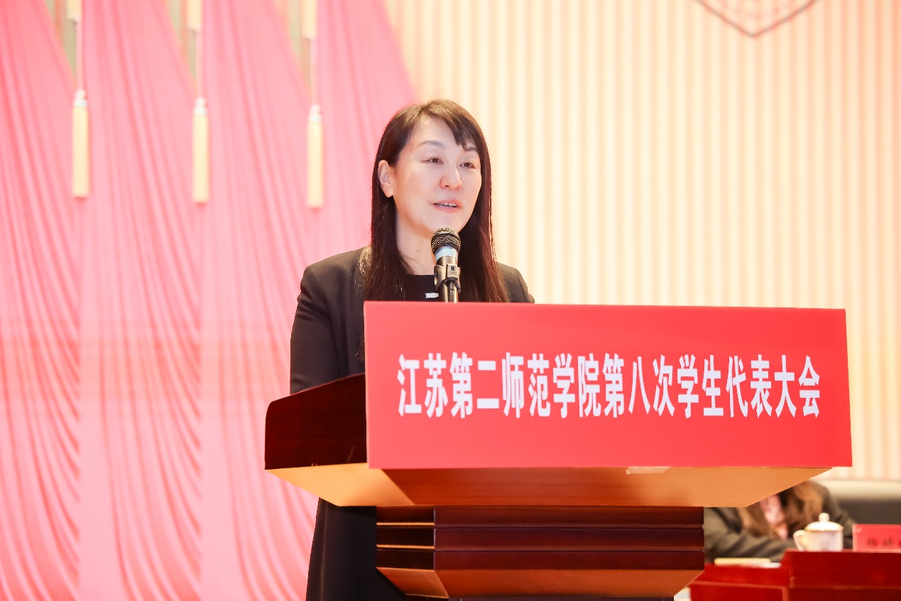 2025年11月5日下午,江苏第二师范学院第八次学生代表大会在石湫校区尚美楼剧场召开。校党委副书记、副校长刘继红,江苏省学生联合会驻会执行主席陆虹宇,党委常委、宣传部部长李安林,党委常委、组织部部长杨思贤,党委学工部部长刘姝,团委副书记沈可,东南大学学生会主席杨晴晴以及我校各学院党总支副书记等应邀到会。本次学代会还收到了来自全国众多兄弟高校的祝贺和支持。