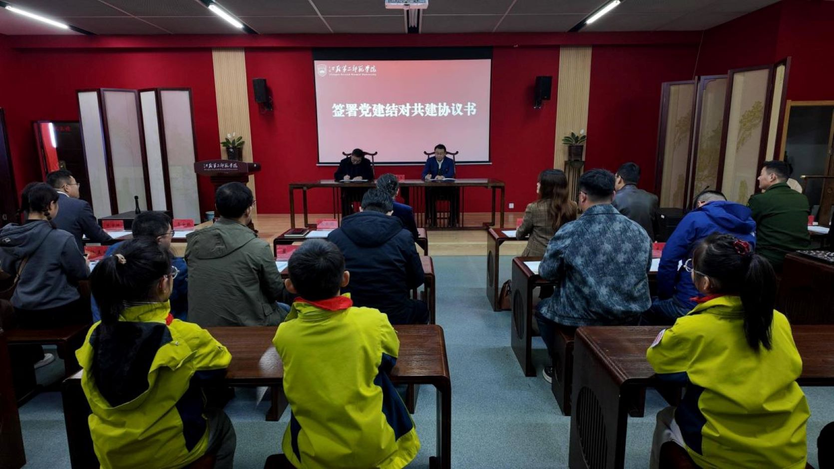 在“汇聚合力、同心共建”阶段,赵玉蓉致辞,她回顾了学校办学积淀与师范教育使命,强调此次结对共建是深化校地合作、推进教育一体化的重要举措,学校将与溧水区在师资共育、课程共建、实践共研等方面进一步开展深度合作。张士顺对校地党建联建工作取得的系列成效予以充分肯定,并期待双方以党建为引领,携手打造校地协同的育人体系。双方代表签署党建结对共建协议书,与会师生共同参观中华优秀传统文化传承基地并签署长卷。