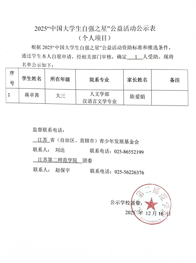 根据2025“中国大学生自强之星”公益活动资助标准和推选条件,通过学生本人自愿申请,经相关部门审核,确定1 人受助。现将名单公示如下: