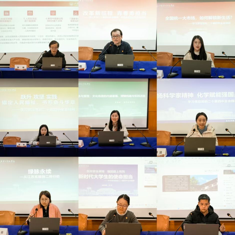 为深入学习贯彻党的二十届四中全会精神,提升理论宣讲的针对性、专业性和实效性,12月30日下午,我校党委理论宣讲团在草场门校区教育技术楼一楼报告厅举行集体备课会。南京师范大学马克思主义学院集群(学部)部长王永贵教授作专题辅导。理论宣讲团、青年宣讲团成员参加会议。