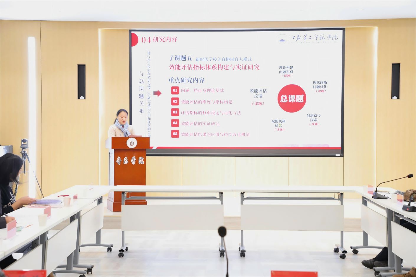 课题组核心成员、我校大学生艺术教育中心主任、音乐学院院长孙婷详细阐述了课题的研究背景、研究目标、研究内容以及研究计划,重点强调了美育协同育人模式在新时代教育中的重要意义。她指出课题组设置五个子课题,形成“理论建构—现状调查—路径创新—技术赋能—效能评估”的螺旋上升式研究闭环,旨在构建具有中国特色的美育协同育人理论体系,建立科学可量化的效能评估指标体系,形成可复制推广的实践模式。