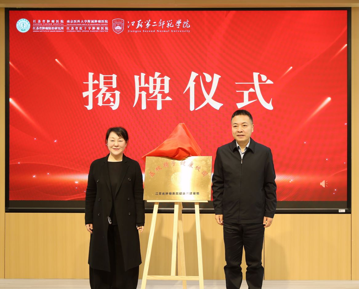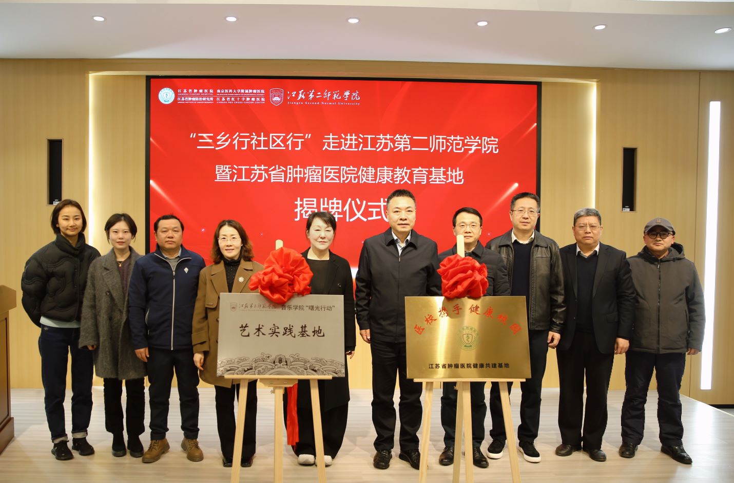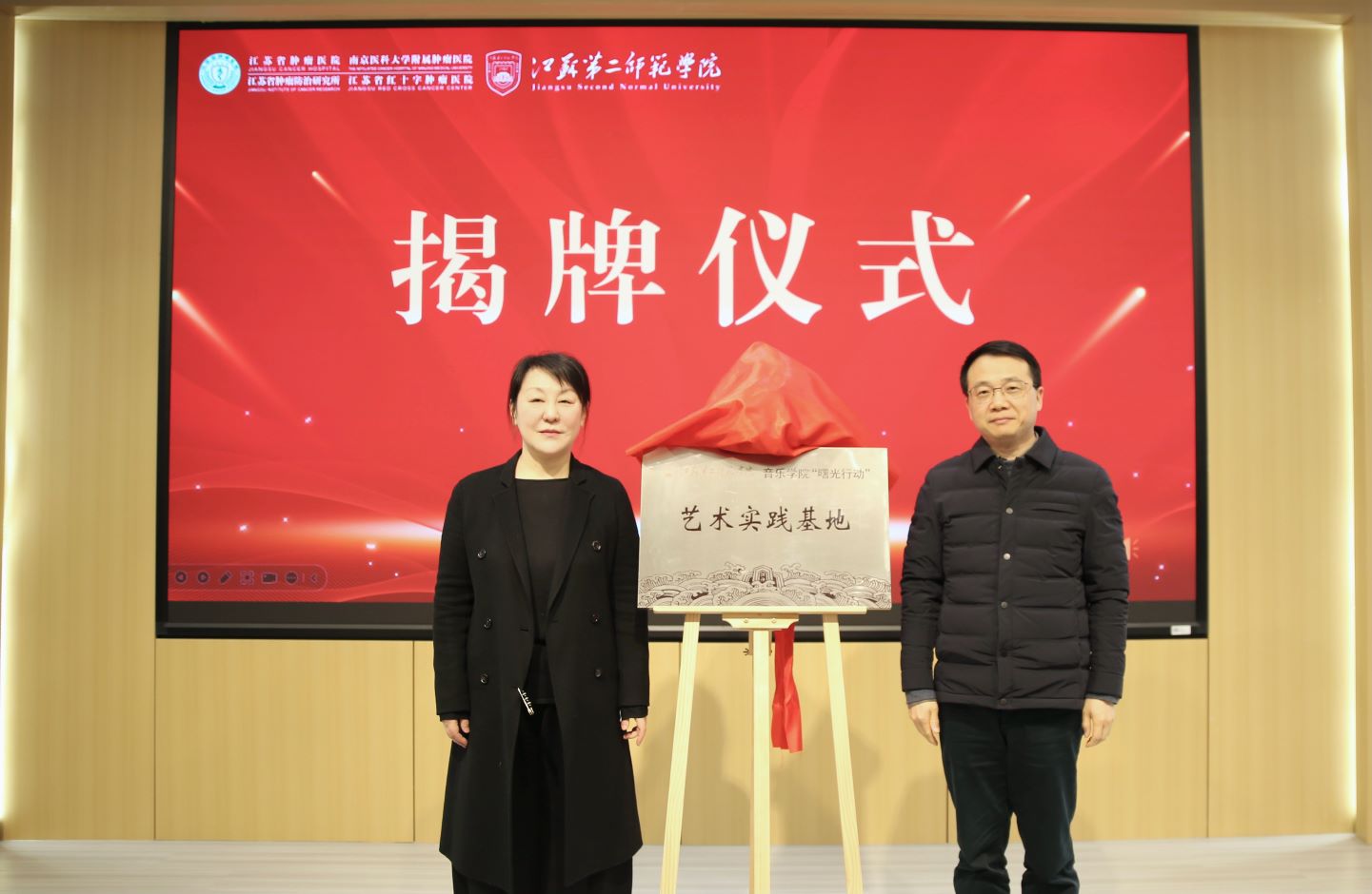 双方领导共同为江苏省肿瘤医院健康共建基地、江苏第二师范学院音乐学院 “曙光行动” 艺术实践基地揭牌。