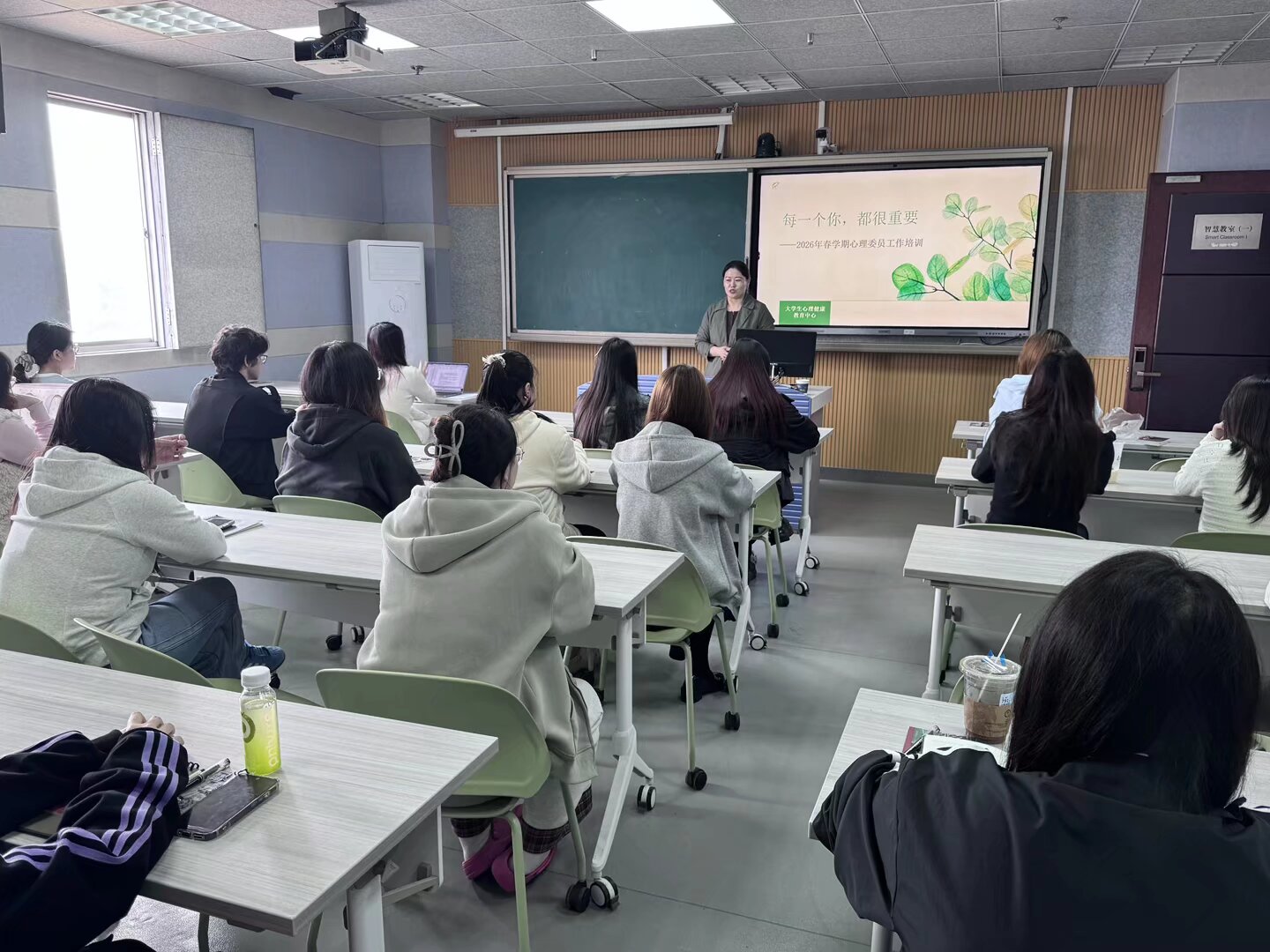 2026年4月15日,大学生心理健康教育中心在两校区开展2025级心理委员工作培训,由周韵、孙盛、彭博三位老师主讲。本次培训针对心理委员的角色定位、职责要求、工作方法及常见心理问题识别与应对等内容展开系统讲解。