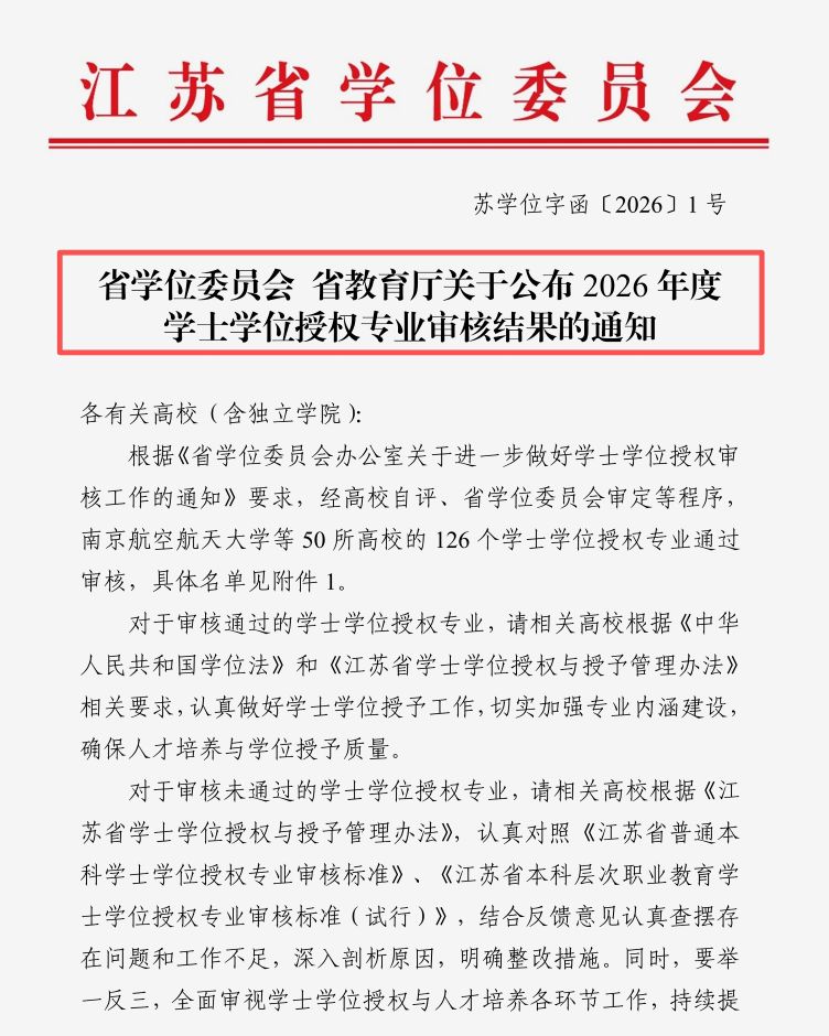 近日,江苏省学位委员会、江苏省教育厅发布《省学位委员会省教育厅关于公布2026年度学士学位授权专业审核结果的通知》(苏学位字函〔2026〕1号),我校数字经济、地理信息科学、应用心理学、电子科学与技术、数据科学与大数据技术专业顺利通过学士学位授权专业审核,获得学士学位授予权。
