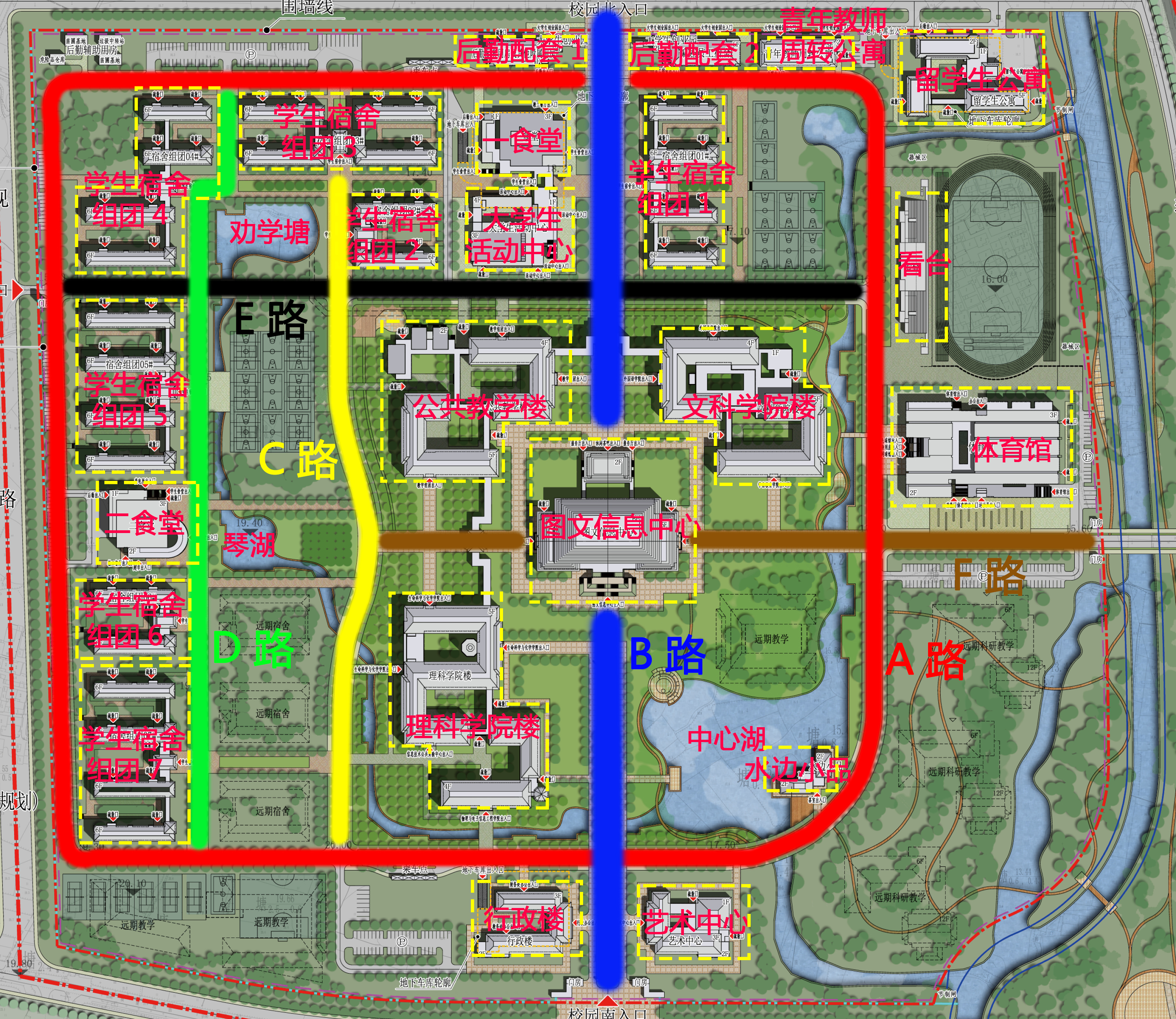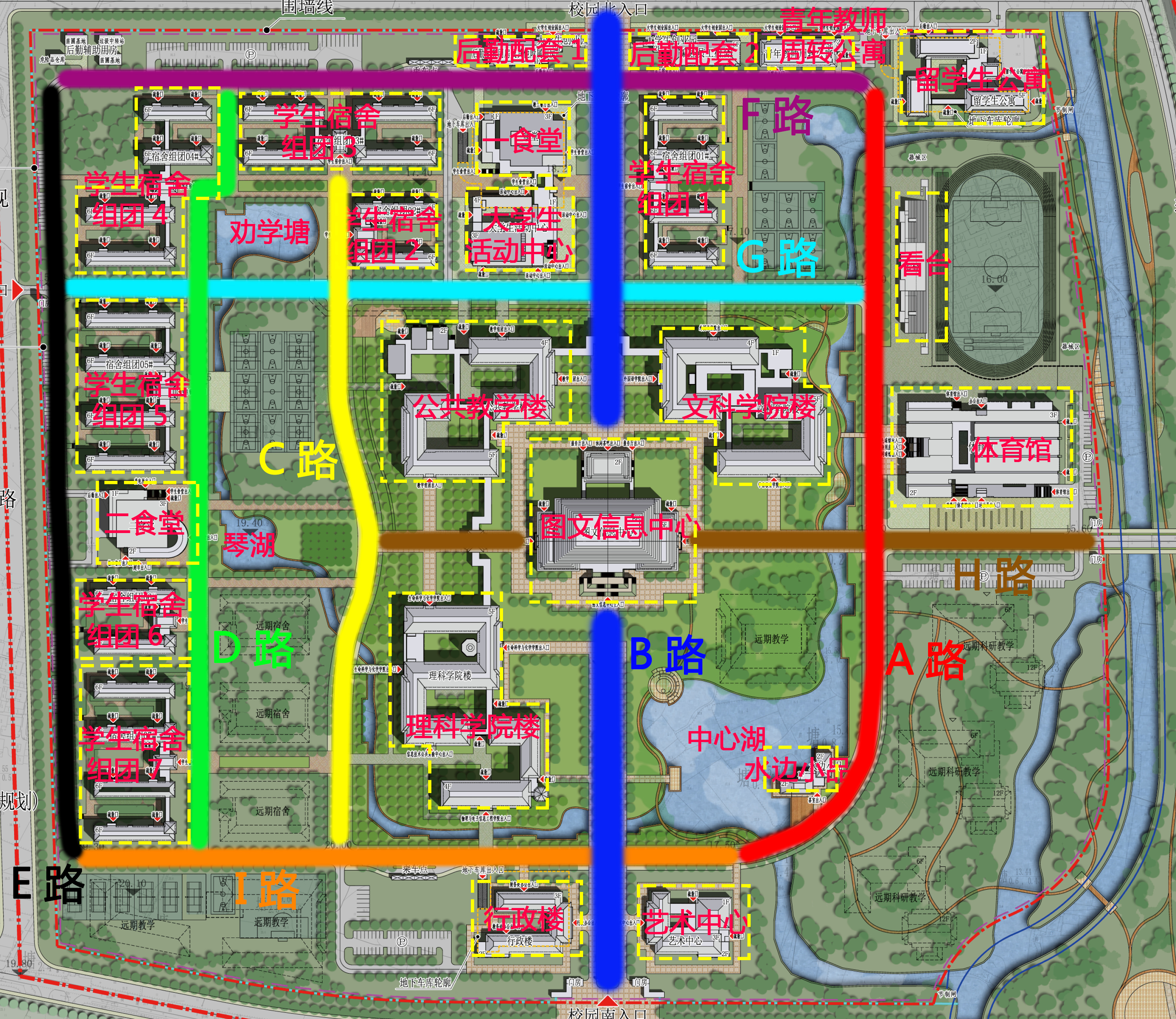 4、道路命名有区位感,对所在方位有标示作用,具有一定文化内涵,且风格与周边的建筑物、景色、校园整体协调一致;建筑的命名要体现建筑功能和背景;