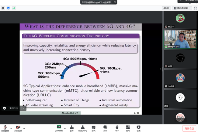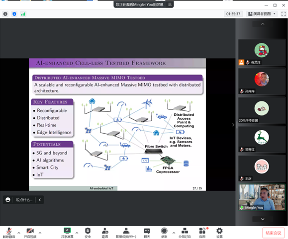 报告上,You教授介绍了人工智能在5G以及IoT中的应用,展示了他们团队搭建的验证测试系统,探讨了人工智能在未来能源管理、数字孪生等方面的应用前景。报告结束后,You教授和我院师生展开了热烈的交流互动。