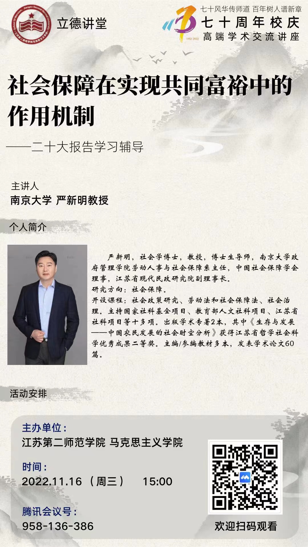 11月16日下午,马克思主义学院主办的“立德讲堂”高端学术交流讲座系列以线上方式成功举办。本次讲座以“社会保障在实现共同富裕中的作用机制”为主题,由南京大学严新明教授担任主讲人,吴岩担任主持人,来自思想政治教育专业的师生近三百人次参加会议。此次活动旨在加深师生对二十大报告的理解,弘扬践行二十大精神。